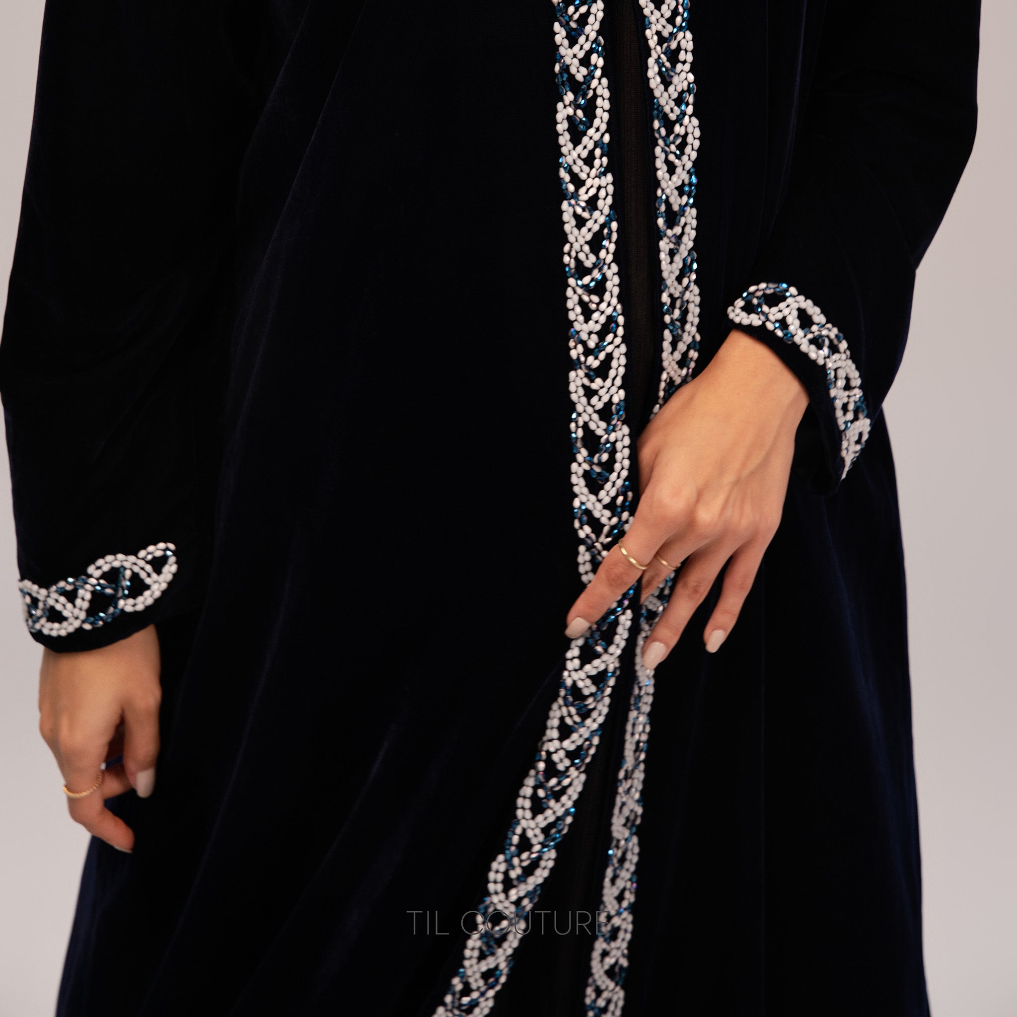 This abaya is made of velvet fabric, lined with silk satin, and embellished with hand-stitched decorative stones. It comes with a matching dress and shawl.