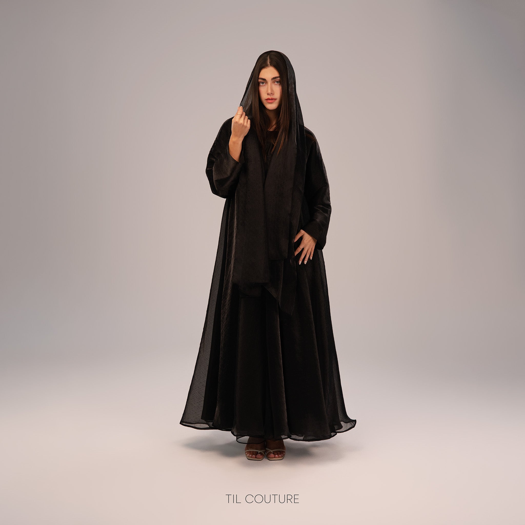 This abaya is made of organza fabric, accompanied by a simple dress made from the same material as the abaya, and a matching shawl.
