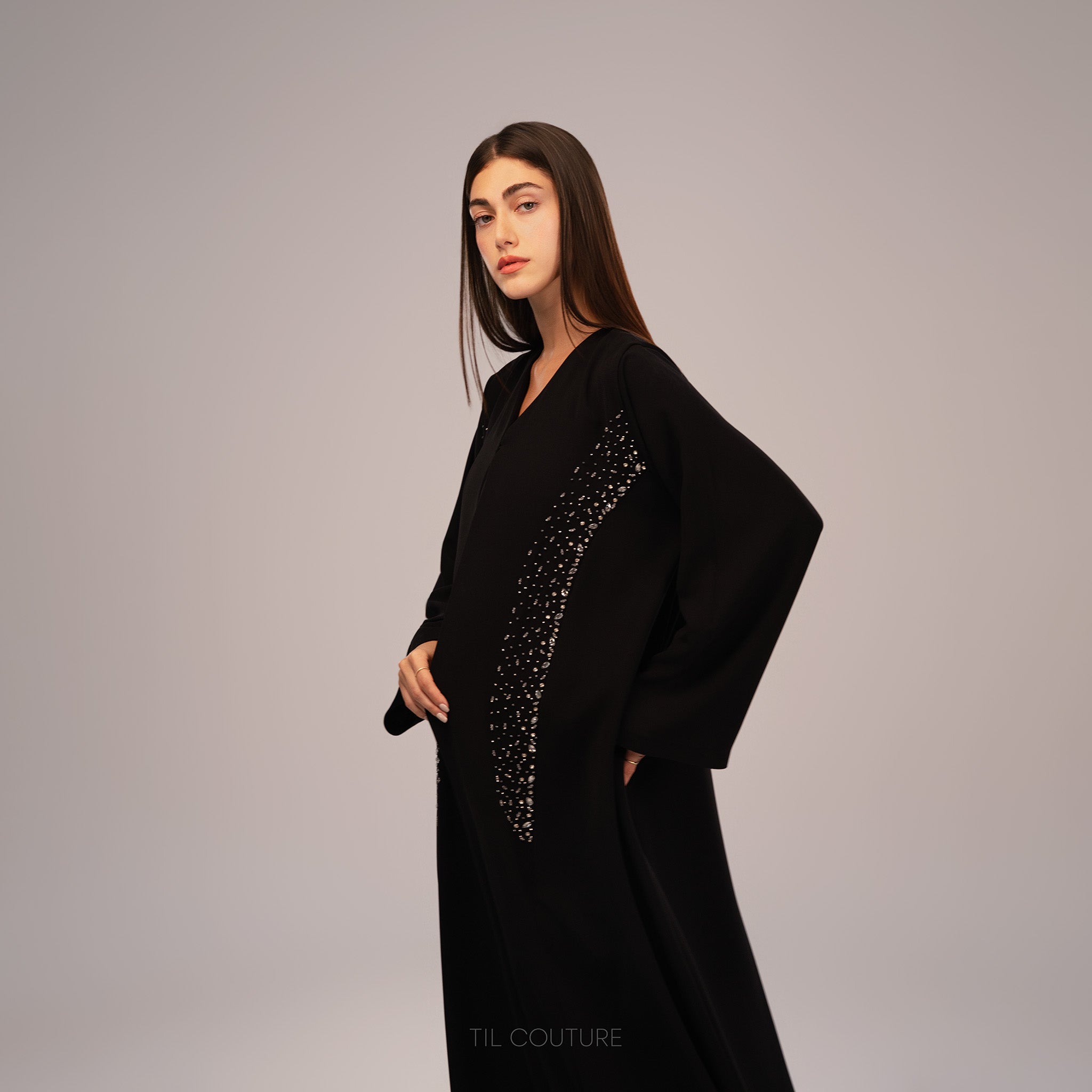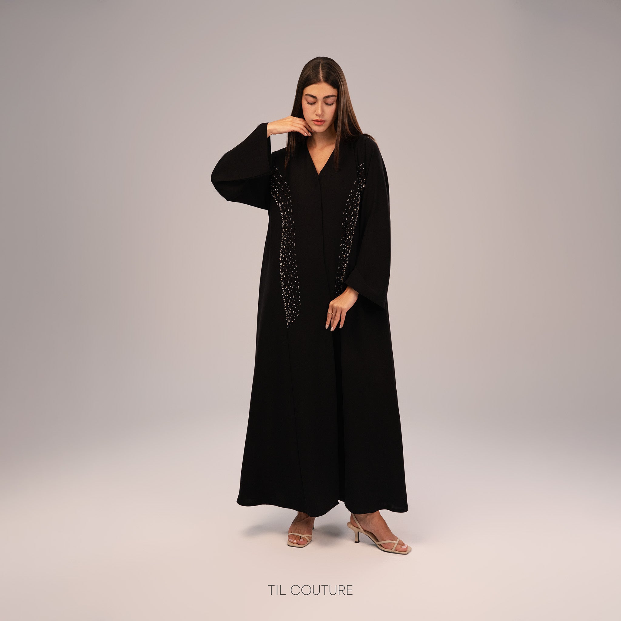 crafted from premium black crepe fabric, this abaya is embellished with elegant decorative stones.